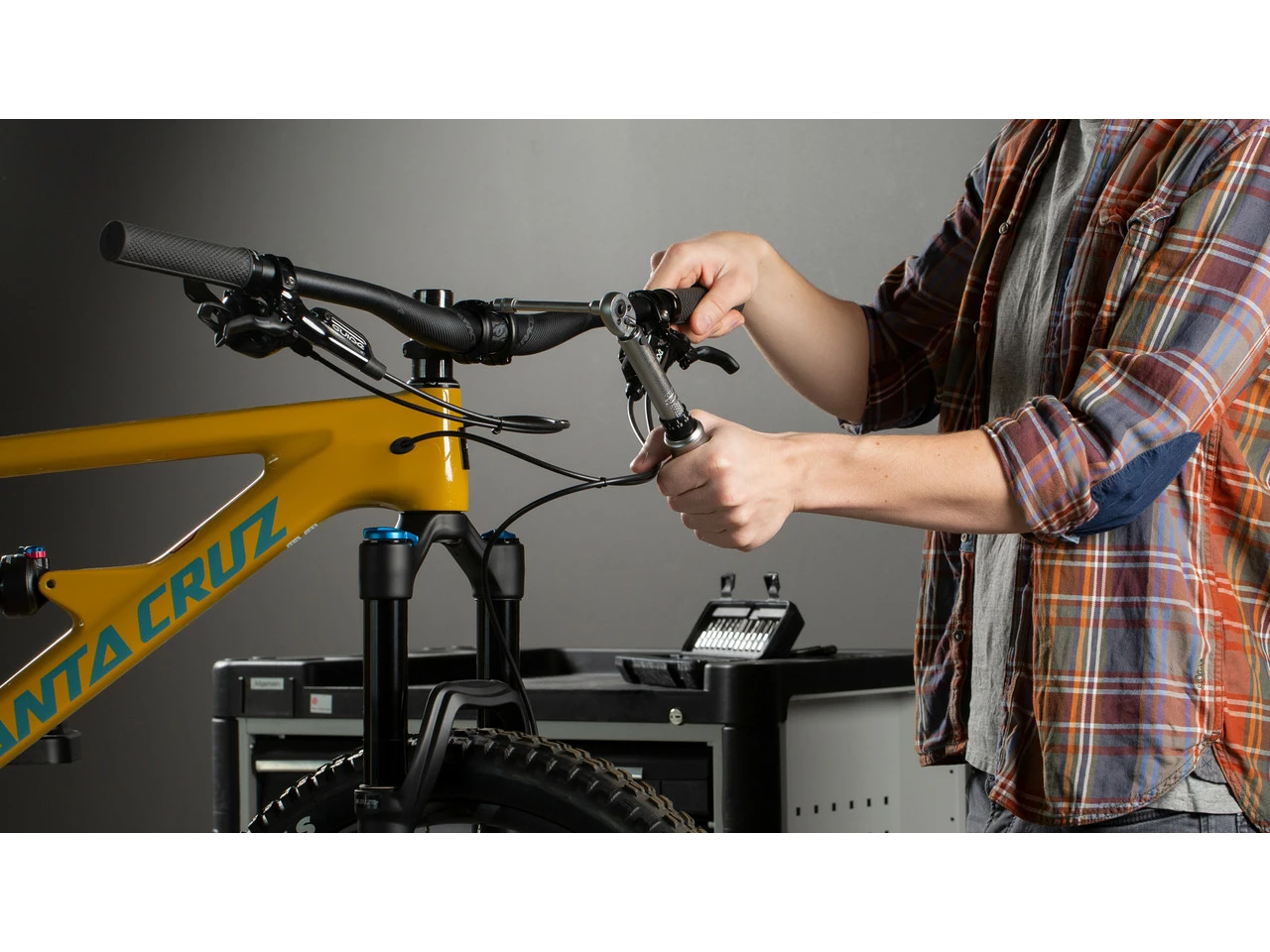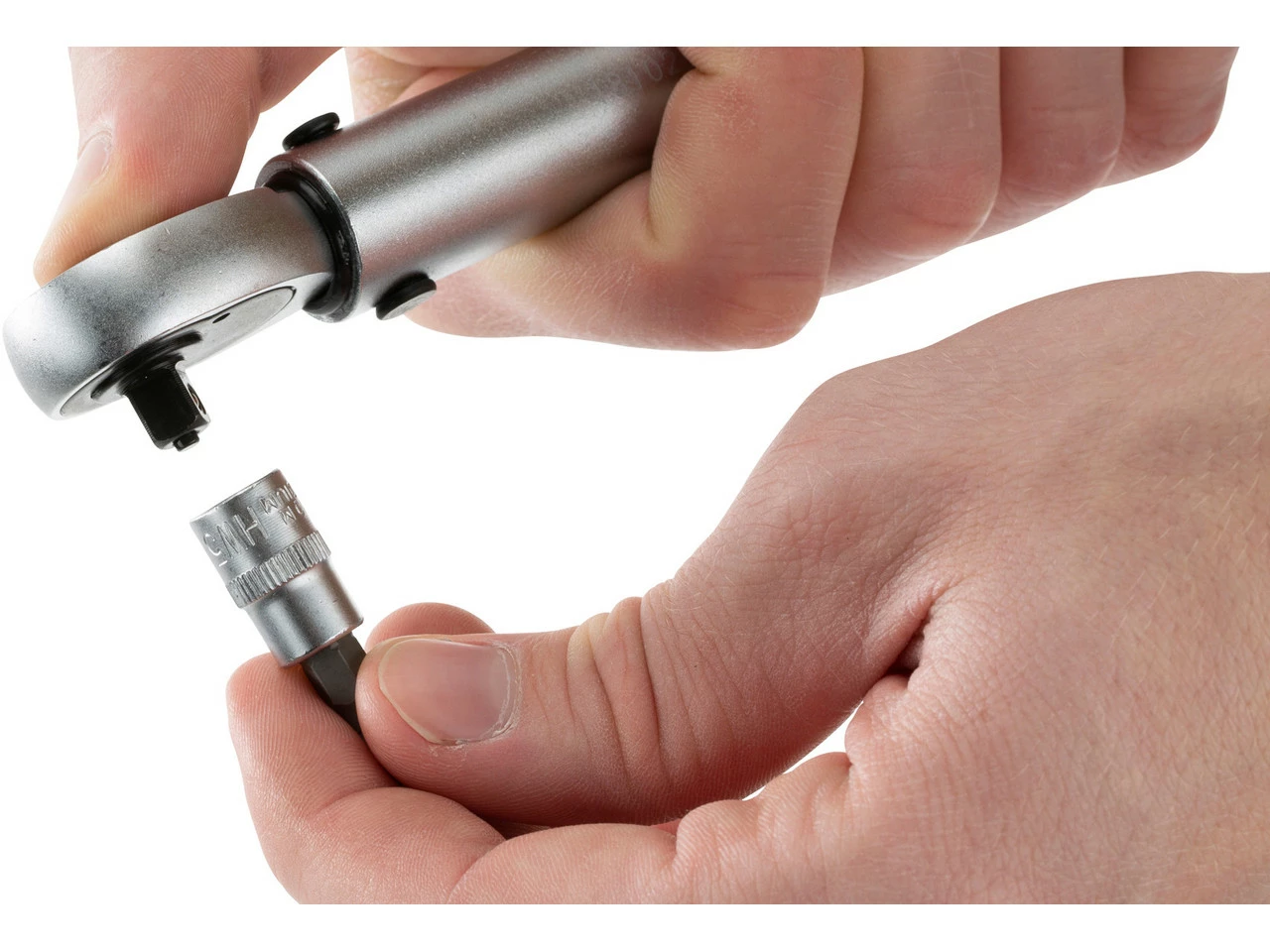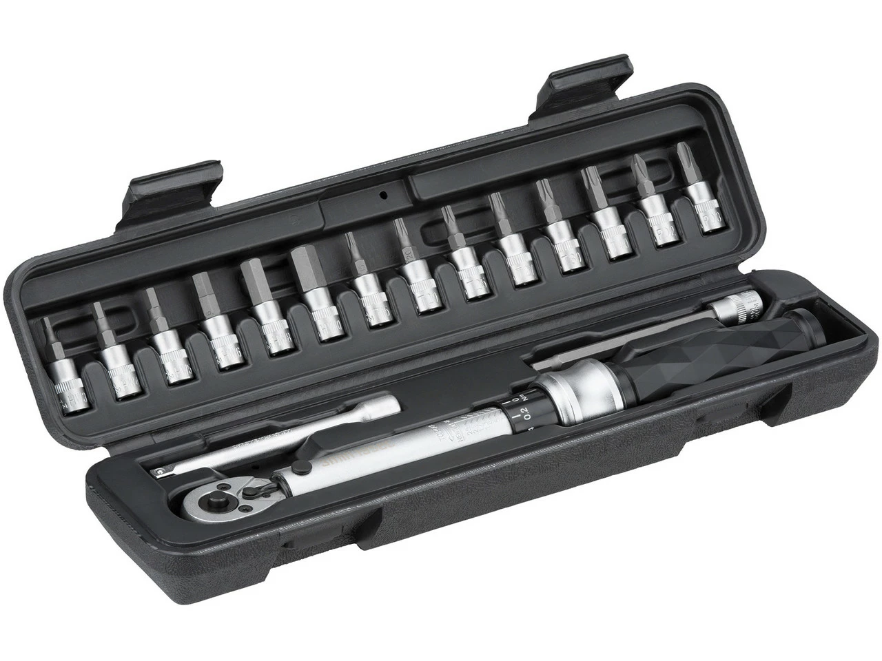 Das 3min19sec Drehmomentschlüssel-Set besteht aus einem Drehmomentschlüssel mit einem Einstellbereich von 1 bis 25 Nm sowie vielen verschiedenen Aufsätzen.