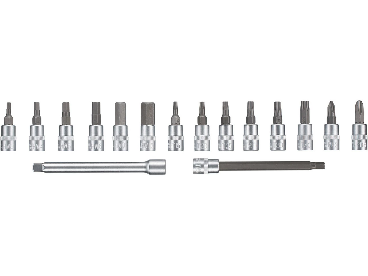 1 x Drehmomentschlüssel 3min19sec6 x Innensechskantaufsatz1 x Innensechskant-Aufsatz extralang6 x Torx-Aufsatz2 x Kreuzschlitz-Aufsatz2 x Steckschlüssel1 x Verlängerung1 x Aufbewahrungsbox