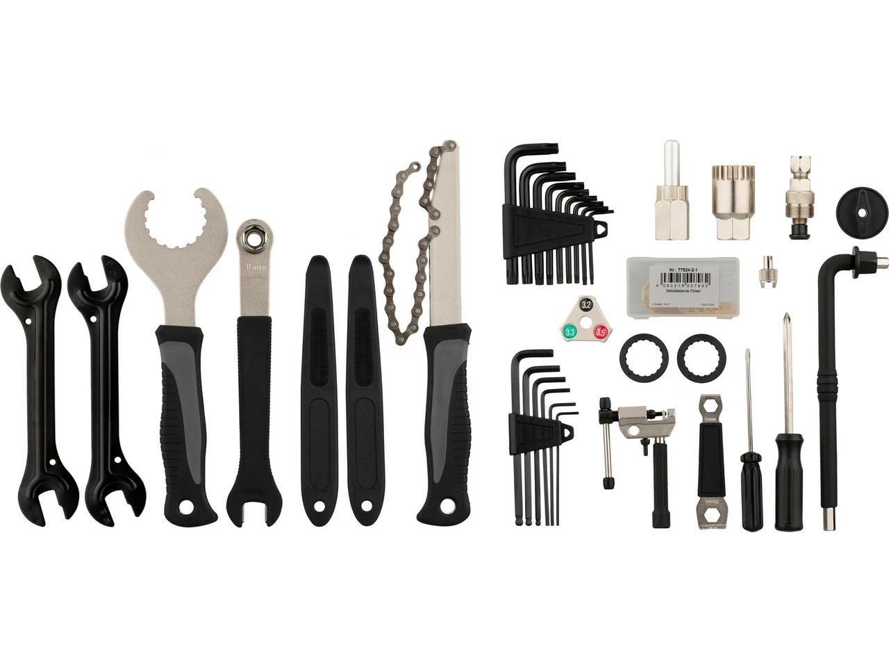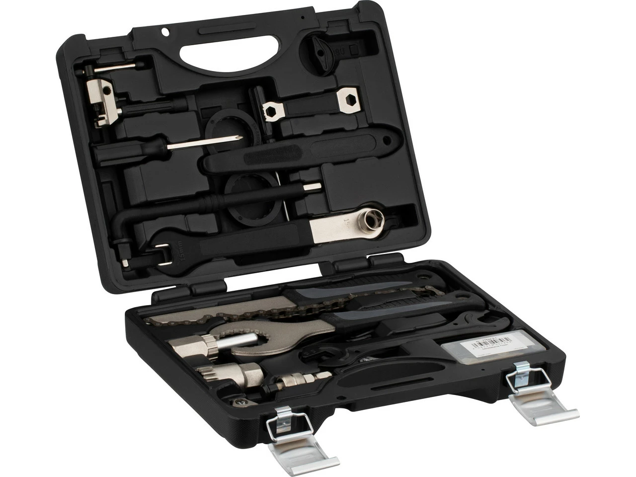 Kette / Kassette: Kettennieter, Kettenpeitsche, Kassettenabzieher für Schnellspanner und Steckachse, auch passend für Center-Lock-Bremsscheiben bei SchnellspannnabenKurbel / Innenlager: Schlüssel für Hollowtech II Kurbelschrauben, Innenlagerabzieher, Innenlagerschlüssel, auch passend für Center-Lock-Bremsscheiben bei Steckachsnaben, Shimano SM-BBR60 Adapter, Shimano SM-BB9000 BB93 Adapter, Kurbelabzieher, Kettenblatt-SchraubenschlüsselReifen / Laufrad: Reifenheber (Paar), Flickset, Ventilschlüssel AV und SV, Speichenschlüssel für 3,2 mm (0.127“) Nippel, Speichenschlüssel für 3,3 mm (0.130“) Nippel, Speichenschlüssel für 3,4 mm (0.136“) NippelPedal / Nabe: Pedalschlüssel, Konusschlüssel 13 mm, Konusschlüssel 14 mm, Konusschlüssel 15 mm, Konusschlüssel 16 mmSchraubwerkzeuge: Schraubendreher mit Wechselklinge: flach 5 mm / Phillips, Schraubendreher 3 mm, Innensechskant 2 mm / 2,5 mm / 3 mm / 4 mm / 5 mm / 6 mm / 8 mm, Torx T10 / T15 / T20 / T25 / T30 / T40 / T45 / T50Weitere Informationen zum Werkzeugkoffer