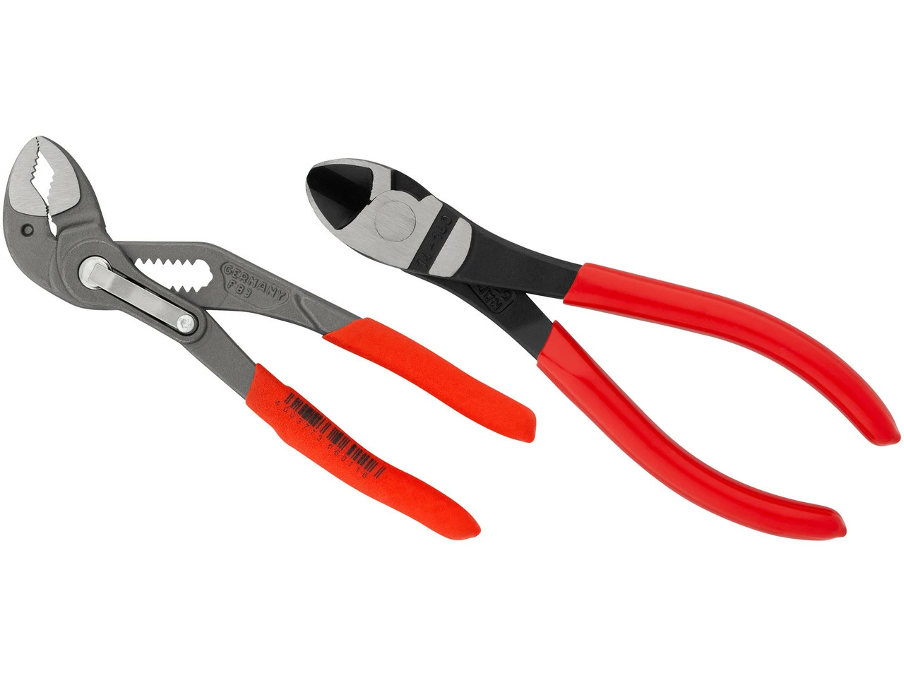 Technische Daten Cobra® Wasserpumpenzange:Länge:150 mmZange:grau atramentiertKopf:poliertGriffe:mit rutschhemmendem Kunststoff überzogenKapazität Rohre:Ø 1 1/4 Zoll / 32 mmKapazität Muttern (Innensechskant-Durchmesser):30 mmEinstellpositionen:11Technische Daten Kraft-Seitenschneider:Schneidwert mittelharter Draht:Ø 3,4 mmSchneidwert harter Draht:Ø 2,5 mmSchneidwert Pianodraht:Ø 2,0 mmLänge:160 mmZange:schwarz atramentiertKopf:poliertGriffe:mit Kunststoff überzogenForm:0 (= Standard)Sonstiges:Schneide mit FacetteFeatures Set:Werkzeugtasche aus strapazierfähigem Polyester-Gewebe, mit Klettverschluß und GürtelschlaufeAbmessungen (B x H x T): 70 x 170 x 50 mmFeatures Cobra® Wasserpumpenzange:Einstellung per Knopfdruck direkt am WerkstückFeinverstellung für optimale Anpassung an verschiedene Werkstückgrößen und handfreundliche Griffstellungselbstklemmend an Rohren und Muttern: kein Abrutschen am Werkstück, kraftsparendes ArbeitenGreifflächen mit spezialgehärteten Zähnen, Härte der Zähne ca. 61 HRC: dauerhaft sicheres Greifen durch hohe Verschleißfestigkeitdurchgestecktes Gelenk: hohe Stabilität durch doppelte Führungsicheres Einrasten des Gelenkbolzens: keine unbeabsichtigte VerstellungKlemmschutz verhindert QuetschverletzungenChrom-Vanadium-Elektrostahl, geschmiedet, ölgehärtetFeatures Kraft-Seitenschneider:für härteste, dauerhafte Beanspruchunghohe Schneidleistung bei geringem Kraftaufwand durch optimale Abstimmung von Schneidenwinkel und ÜbersetzungsverhältnisPräzisionsschneiden zusätzlich induktiv gehärtet, (Schneidenhärte ca. 64 HRC) für alle Drahtsorten einschließlich PianodrahtChrom-Vanadium-Hochleistungsstahl, geschmiedet, ölgehärtet20 % Kraftersparnis im Vergleich zu herkömmlichen Seitenschneidern gleicher Längemit angeschmiedeter GelenkachseHerstellernummern:Set:00 20 72 V02Wasserpumpenzange Cobra®:87 01 150Kraft-Seitenschneider:74 01 160Lieferumfang:1 x Wasserpumpenzange Knipex Cobra®1 x Kraft-Seitenschneider Knipex1 x Werkzeuggürteltasche Knipex