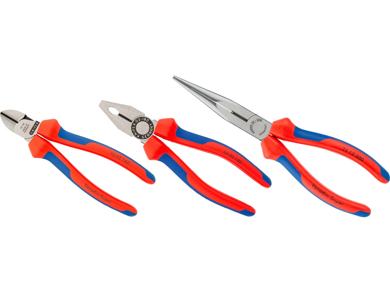 Das Zangenset Montage-Paket von Knipex besteht aus einer Kombizange, einem Seitenschneider und einer Flachrundzange mit Schneide.