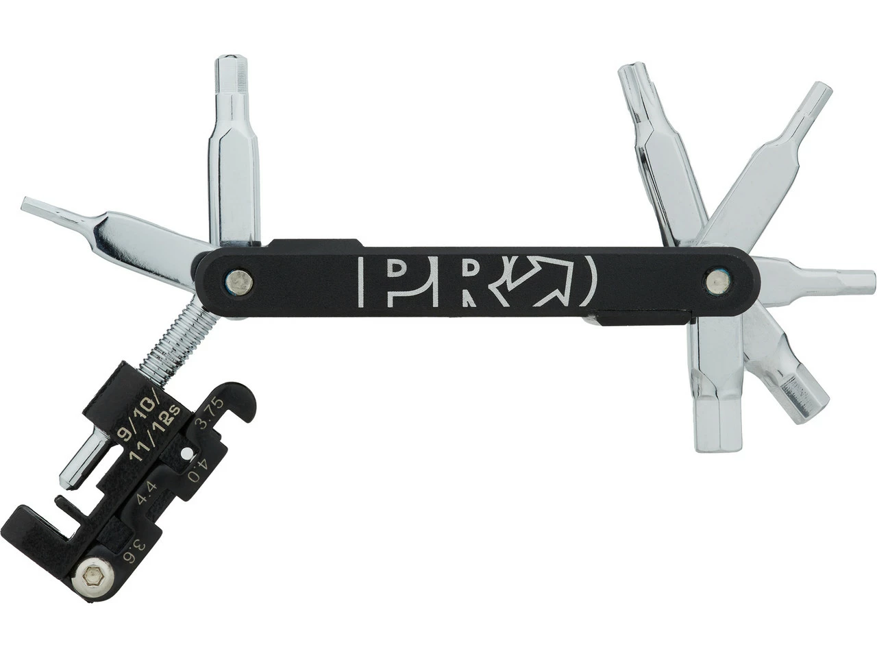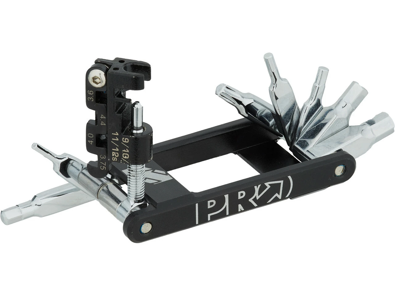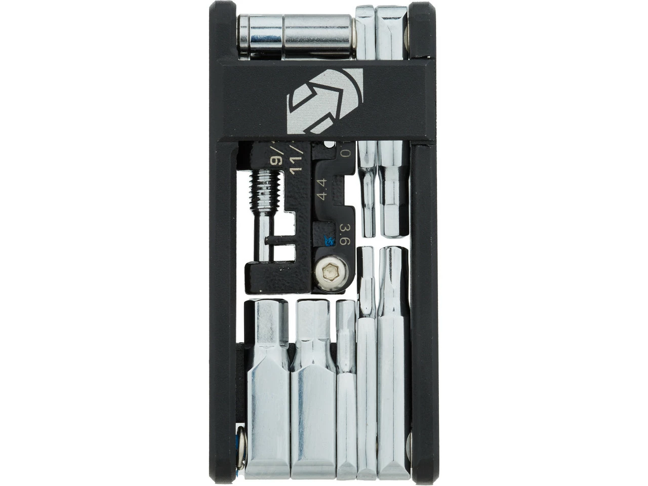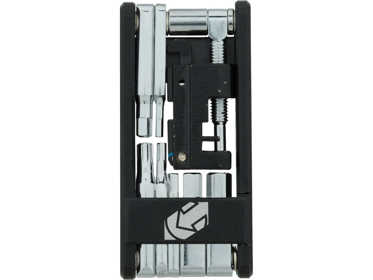 Das Performance 13 Minitool von PRO bietet Dir 13 Funktionen an einem kompakten Werkzeug. Es ist mit diversen Innensechskantschlüsseln, einem Torx T25 und verschiedenen Nippelspannern ausgestattet. Ein Kettennieter für 9- bis 12-fach-Ketten sowie ein Ventilschlüssel sind ebenfalls mit dabei.