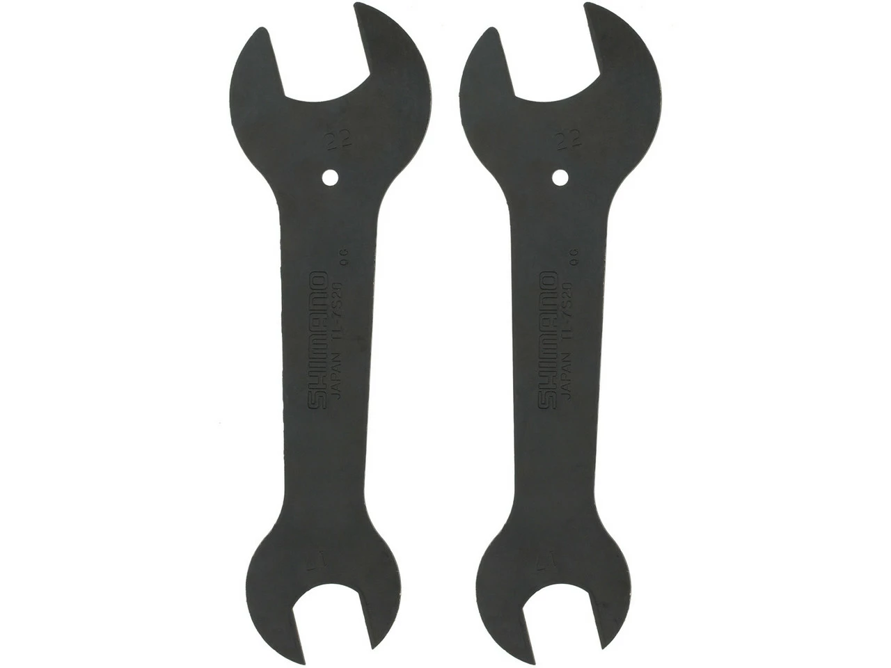 Die Shimano Konusschlüssel TL-7S20 dienen der Montage, Demontage und der Einstellung von Konuslagern in Shimano Naben. Es handelt sich um zwei Maulschlüssel jeweils mit 17- und mit 22-mm-Öffnung. Sie bestehen aus gehärtetem Stahl und sind daher besonders robust.