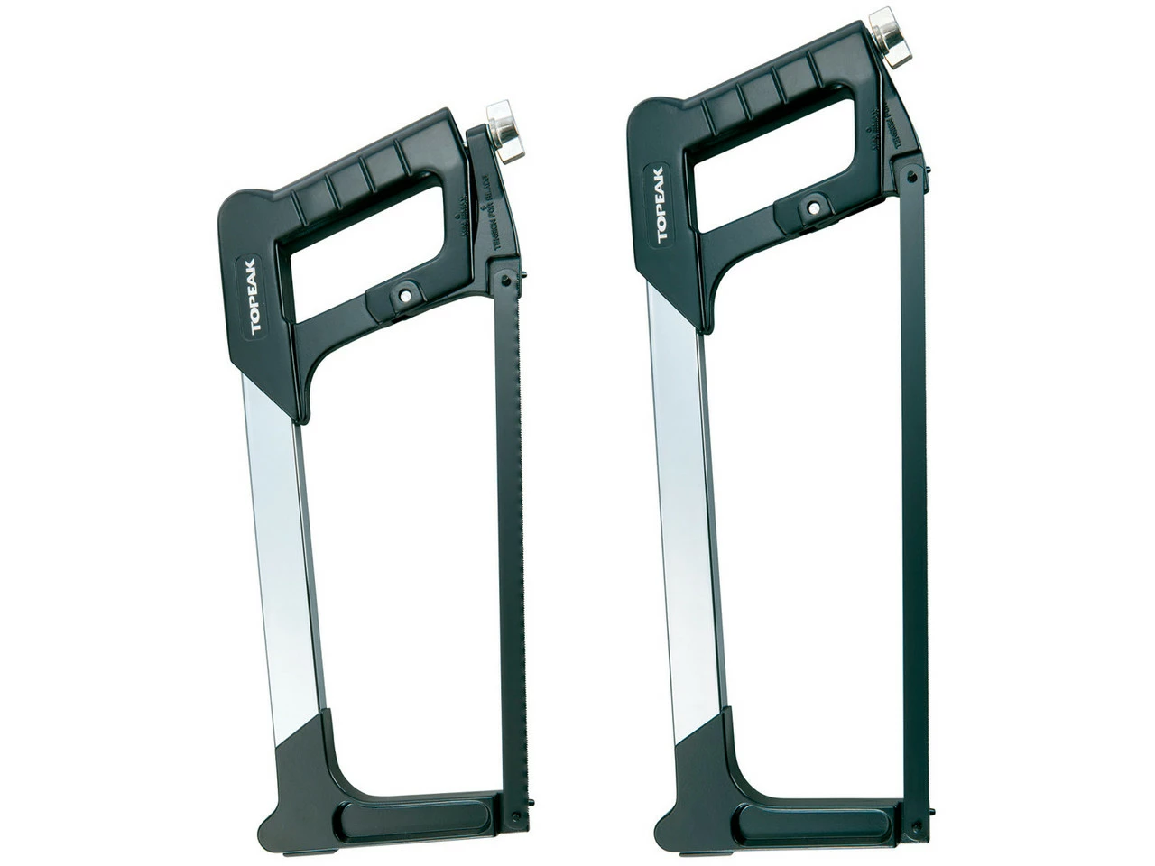 Die HackSaw Säge von Topeak eignet sich zum Sägen von Aluminium- und Carbonrohren. Ihr Rahmen lässt sich verstellen, um 10″ und 12″ Sägeblätter zu montieren, zusätzlich kann ein Schneidwinkel von 45° oder 90° genutzt werden.