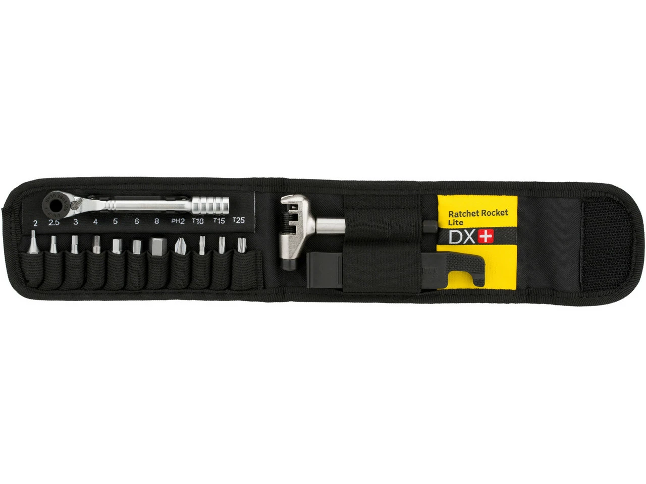 Das kompakte Topeak Ratchet Rocket Lite DX+ Werkzeugset kommt mit umschaltbarer Feinzahnratsche mit Präzisions-Daumenhebel für schnelle Richtungswechsel, Werkzeugbits aus gehärtetem Stahl, zwei Reifenhebern, Kettennieter und einem magnetischen Bithalter.