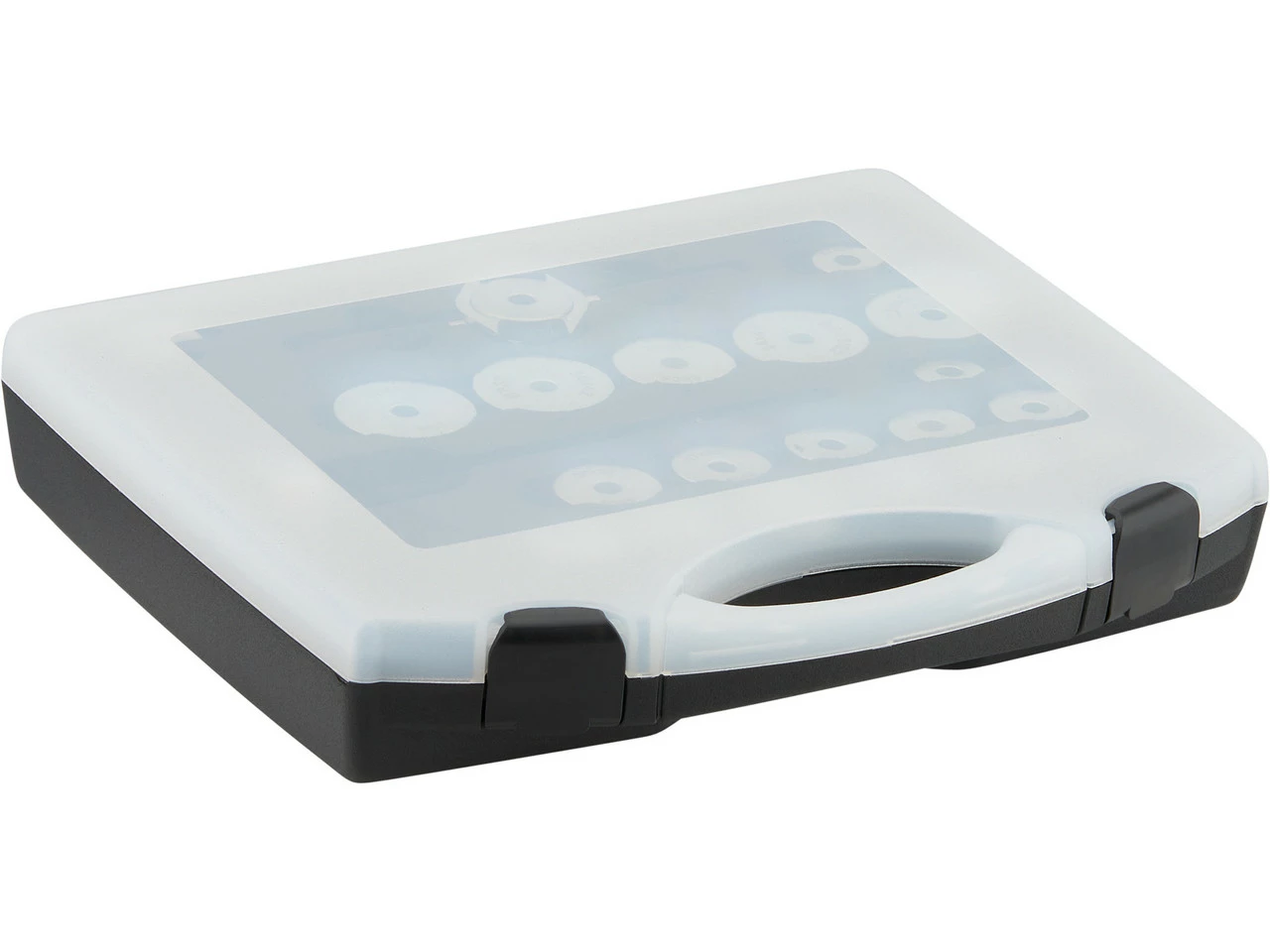 Spezifikationen:Funktion:Montage von Industrielagern, Montage von InnenlagernWerkzeugtyp:SonderwerkzeugKompatibilität:alle BB30 und Pressfit-InnenlagerGröße:608 / 1526 / 6000 / 6001 / 6802 / 6803 / 6804 / 6805 / 6900 / 6901 / 6902 / 6903 / R6 / 28×17 (Hope)Technische Daten:Material:StahlGriffmaterial:KunststoffFeatures:universelles Lagereinpress-Set für die Montage von Lagern in Rahmen und Komponentenbestehend aus zwei Gewindespindeln mit Handgriffen, Adaptern für zahlreiche Lagergrößen und zwei Kunststoffadaptern als Rahmenschutzeine Gewindespindel mit Standard-Griff, die andere mit Quick-Release-System: Griff kann auf Spindel fixiert werdendadurch ist bei Innenlagern das Arbeiten von zwei Seiten möglichkompakte Kunststoff-Box mit zweischichtigem Schaumstoff zur Aufbewahrung