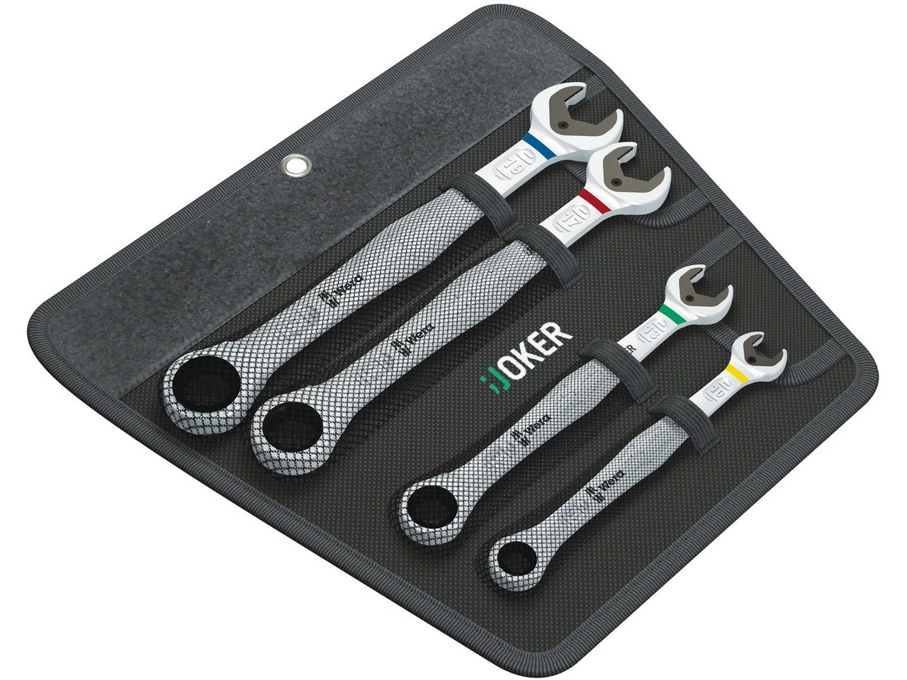 Lieferumfang:4 x Maul-Ringratschenschlüssel Wera Joker (10 / 13 / 17 / 19)1 x Aufbewahrungstasche
