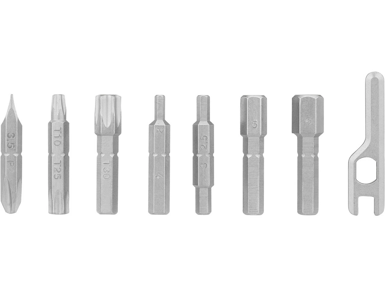1 x Innensechskant-Bit 6 mm1 x Innensechskant-Bit 5 mm1 x Innensechskant-Bit 2 + 4 mm1 x Innensechskant-Bit 2,5 + 3 mm1 x Torx-Bit T301 x Torx-Bit T10 + T251 x Schraubendreher-Bit flach + Kreuz1 x Bit Speichenschlüssel + Ventilwerkzeug